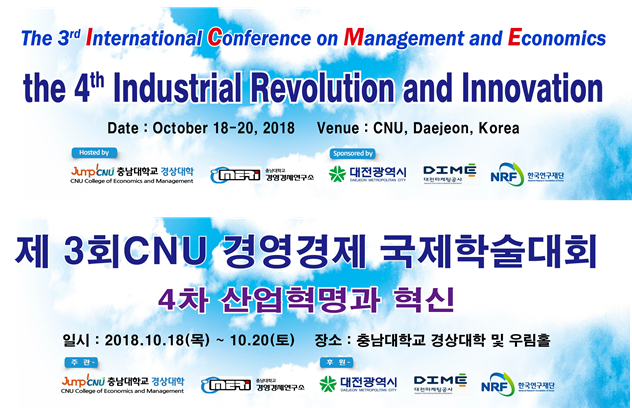- 충남대학교 경상대학 경영경제연구소에서 <4차 산업혁명과 혁신>의 주제로 2018년도 국제학술대회를 개최합니다.